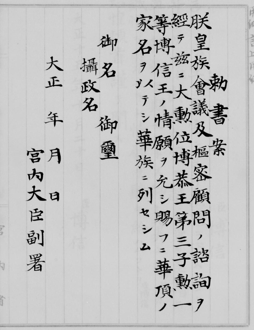 余談だが、宮家の当主を「大宮殿下」「父宮殿下」、長男を「若宮殿下」という習慣があった。現在で言うなら秋篠大宮殿下、秋篠若宮殿下だ。皇族軍人は宮号に軍でのタイトルを付けて呼ばれることがあった。元帥なら伏見元帥宮殿下、司令官なら朝香司令官宮殿下、参謀なら竹田参謀宮殿下など。近代はマスコミの皇室用語の敬称が天皇陛下以外は「さま」で統一されてしまっている。皇后陛下ですら「皇后雅子さま」とは情けない。せめて産経新聞くらいは陛下、親王殿下、内親王殿下を正しく使って欲しいものだ。