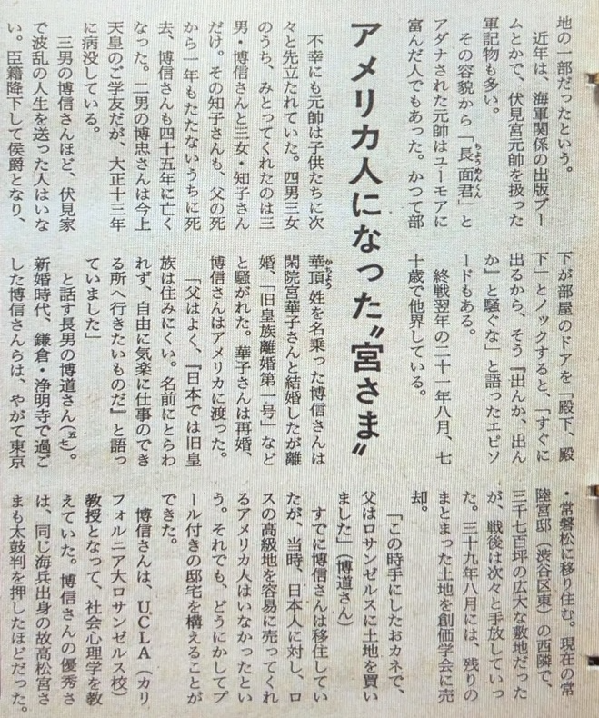 そんな折、昭和26年に華子夫人と46歳で熟年離婚。前代未聞の皇族初の離婚というスキャンダルに見舞われ週刊誌などに書き立てられた。博信は元来物静かで学者気質の性格だったそうで、それは写真の表情からも見て取れるが不倫現場を目撃してしまった時は自分の手を骨折するほど間男の戸田豊太郎を殴り続けたそうだ。バイオレンス☆ヒロノブ