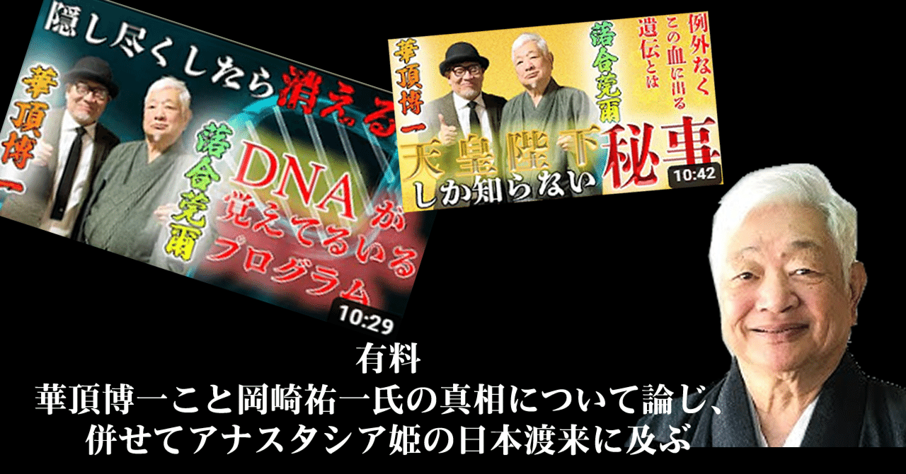私はこれまで丹念に調査を続け、岡崎祐一が人間のクズの詐欺師であることを事細かに証拠を添えて証明してきた。何より岡崎祐一を側で見てきた人たちの証言は大きいし、落合氏の知らない岡崎祐一の裏の顔を知っている。妻にDVを繰り返し、最近でも紹介された女性に対して暴力を振るって警察沙汰にまでなっているし、違法薬物使用疑惑もある。そういう一面を落合氏は当然知らないだろう。その詐欺師の岡崎祐一を何の証拠もなく華頂博信の孫だと認定し、その追認作業まで買って出ている。しかもその記事は誰もが読めるものではなく500円で販売しているという下劣さである。こうなってくると落合莞爾氏は犯罪者を助ける害悪でしかない。この事をもっとよく自覚し、その偉そうな態度を改めて真摯にこの問題をよく調べて真実と向き合って欲しい。皇族詐欺の擁護など許されるものではないことは落合氏もわかっているだろう。これ以上詭弁を続けると後戻りできなくなるのは明白である。ないものを有るといい、事実でないことを事実という。こんなものは洞察でもなんでもない。揺るぎない史実を証拠を添えて一突きすれば脆くも崩れ去る砂上の楼閣である。